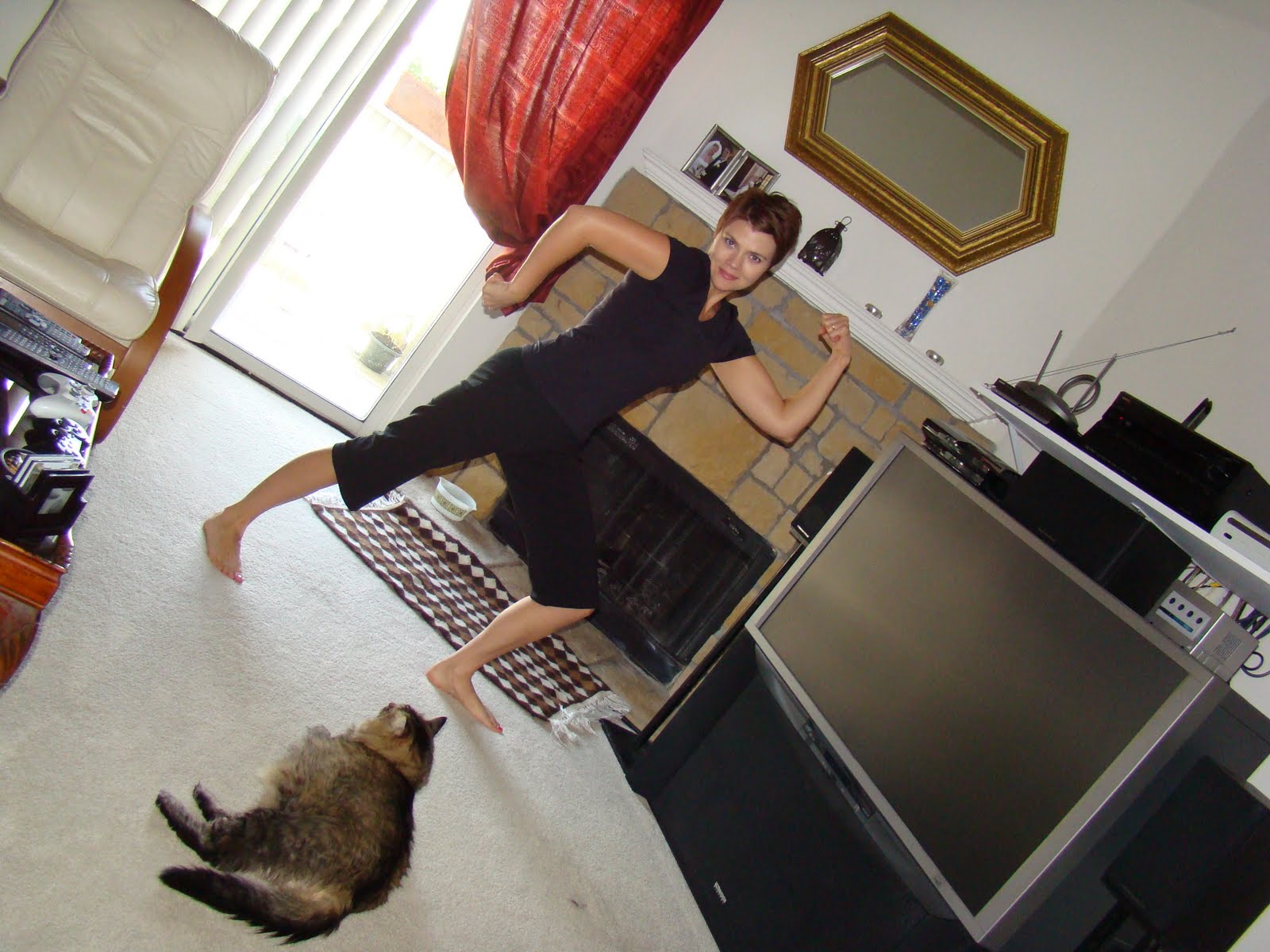 My new duds. And Mister, wondering why the heck I'm posing like a complete dork and not feeding him. |
